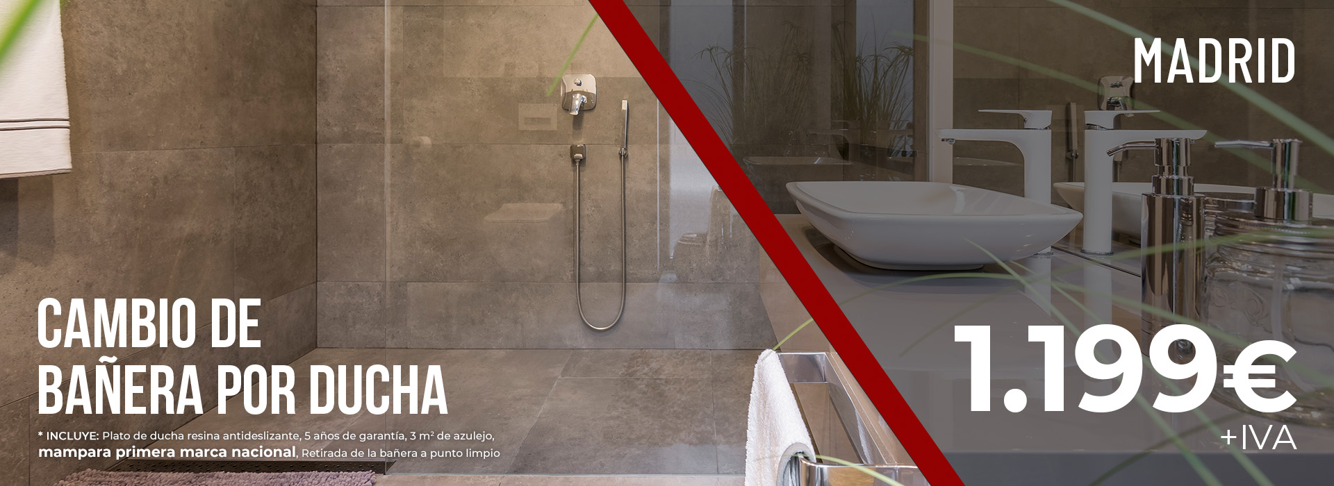 El cambio de bañera por ducha cuesta 1.099€ + IVA. Dentro del precio incluye también el plato de ducha de resina antideslizante, 5 años de garantía, 3m2 de azulejo, la mampara y la retirada de la bañera al punto limpio.